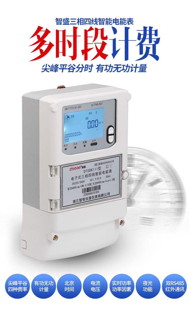 三相多功能電能表能夠精確地計量正向有功電能、反向有功電能,且可以實現(xiàn)分時計費的功能。電能表采用液晶顯示,具有紅外和