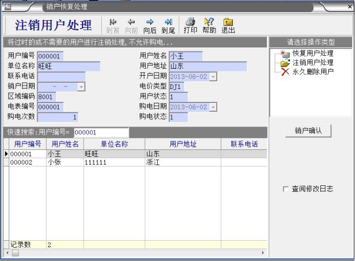 ,鼠標左鍵“銷戶恢復(fù)處理”,出現(xiàn)以下對話框: