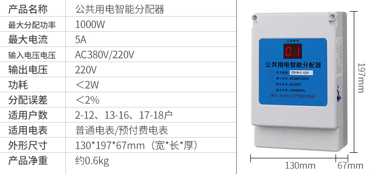 一、智盛牌公共用電智能分配器,是將公共樓道用電所消耗的電能(如樓道燈,對講防盜門等),自動分配到各受益用戶的電表中。每天輪流接通一戶電表,開機通電時第一戶電表隨機產(chǎn)生,達到公平分攤電費的目的,本款公共用電智能分配器的特點:外置保險絲更換方便,可實時顯示均分到哪戶。